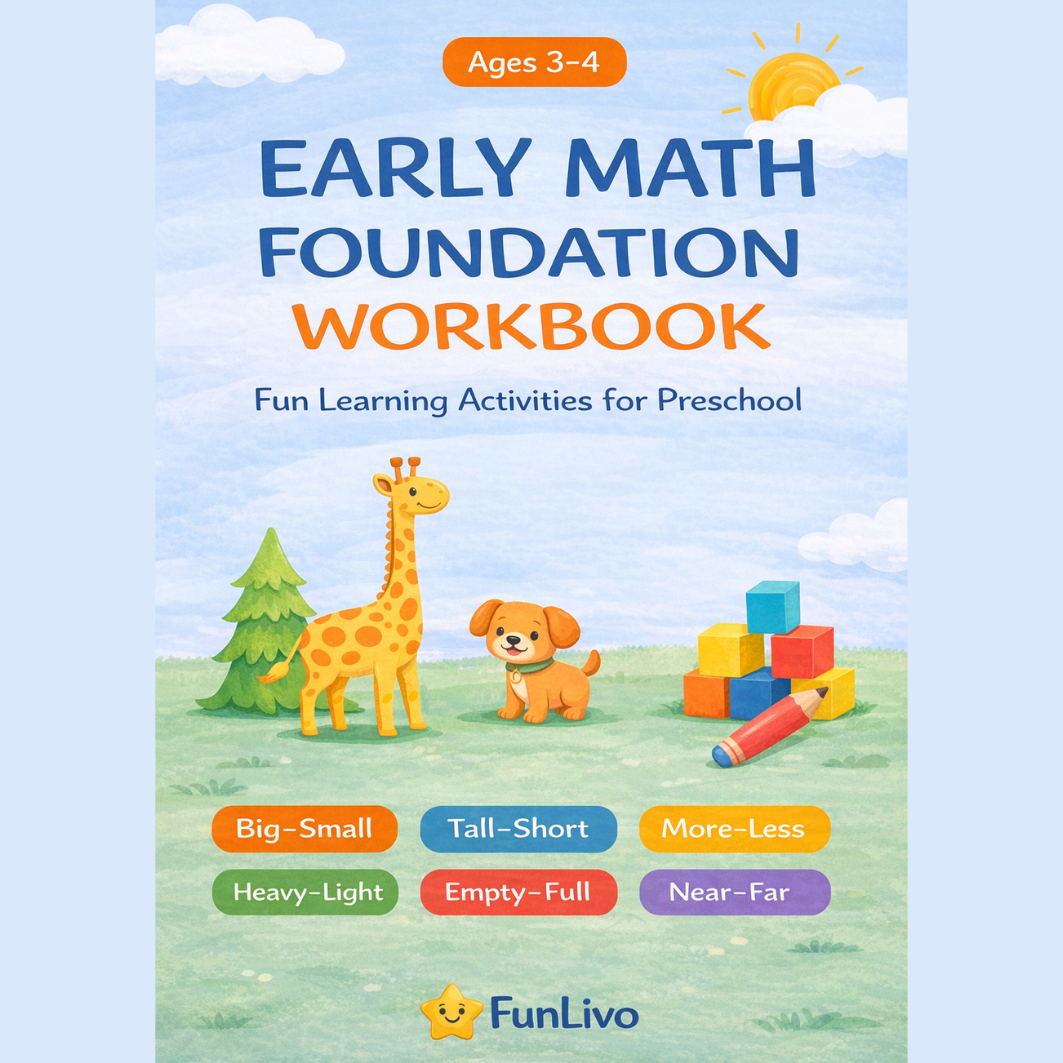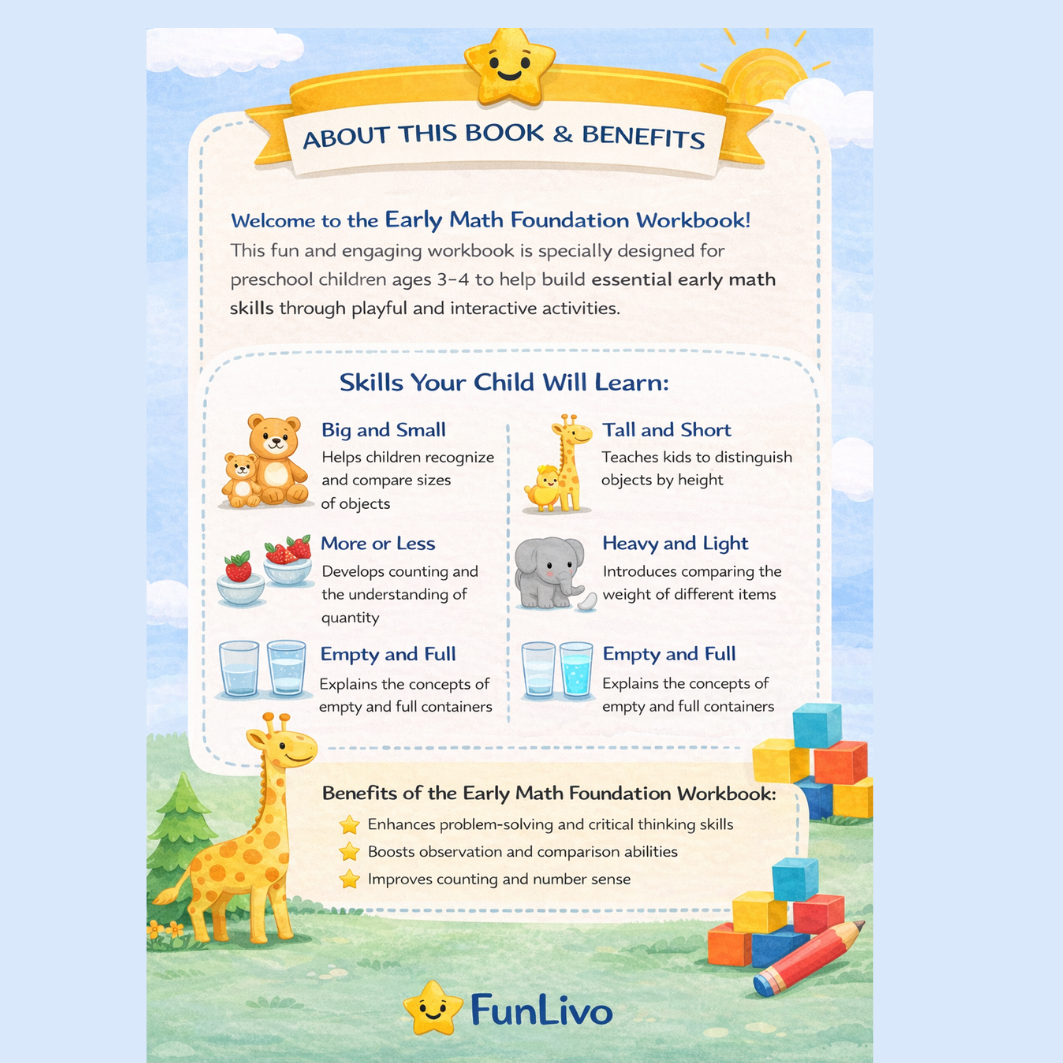 The early math foundation workbook is designed for preschool children ages 3–5 to build strong pre-math skills through simple, hands-on activities. This printable workbook focuses on core comparison and observation concepts that children must understand before moving on to numbers and calculations.