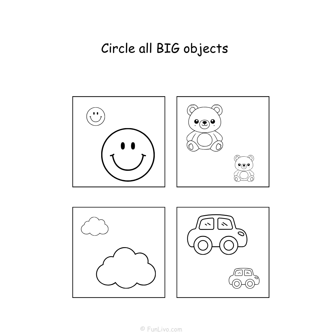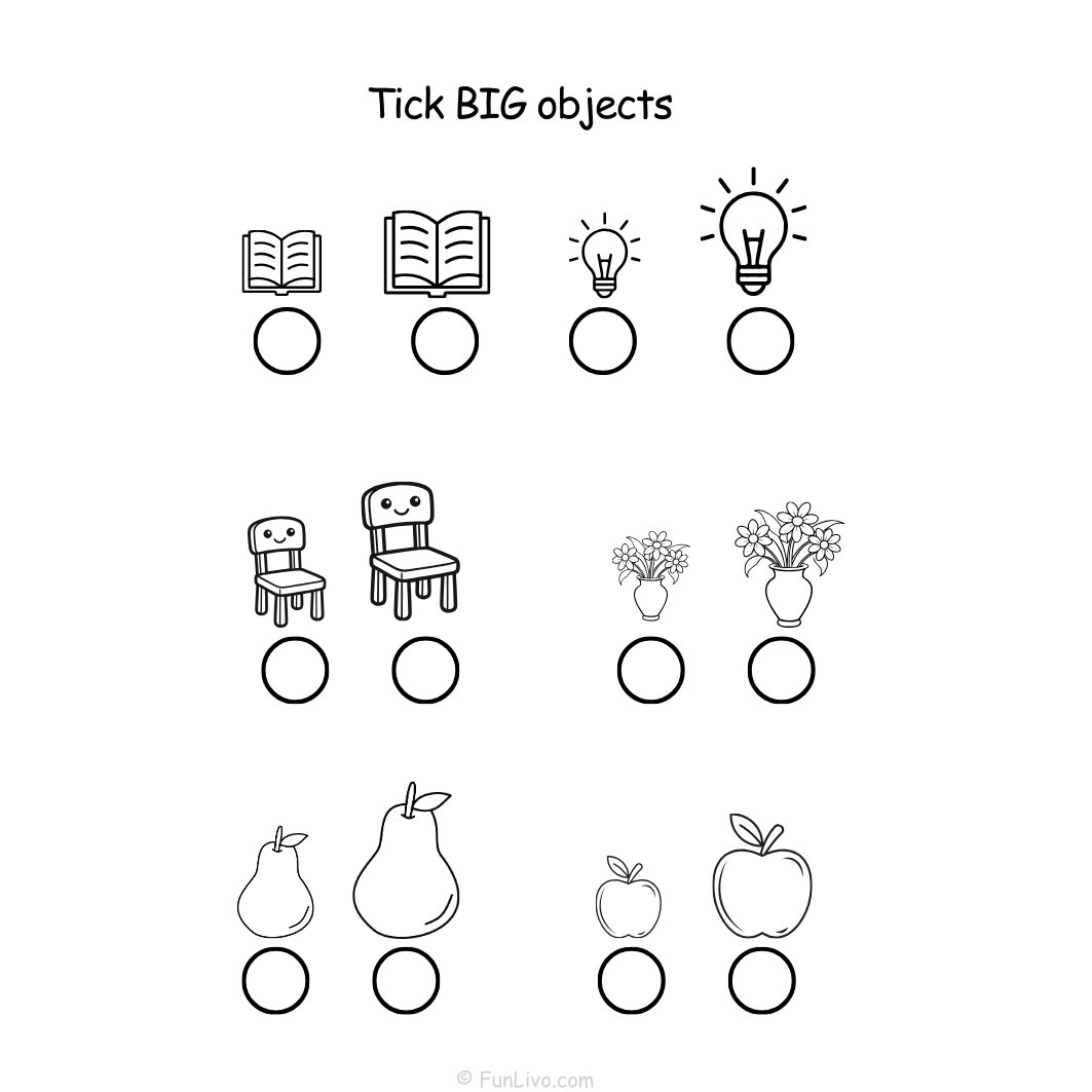 Inside this early math foundation workbook, children practice essential skills such as big and small, tall and short, more and less, heavy and light, empty and full, and near and far. Each worksheet includes one clear task, helping young learners stay focused without feeling overwhelmed.