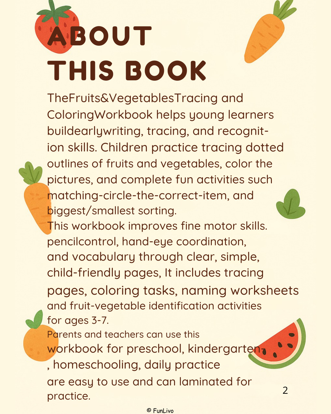 Kids trace dotted outlines of fruits and vegetables, color each picture, and complete simple early-learning tasks like matching, naming, and identifying biggest/smallest objects. The workbook supports ages 3–7 and is designed for preschool, kindergarten, homeschooling, and daily home practice.