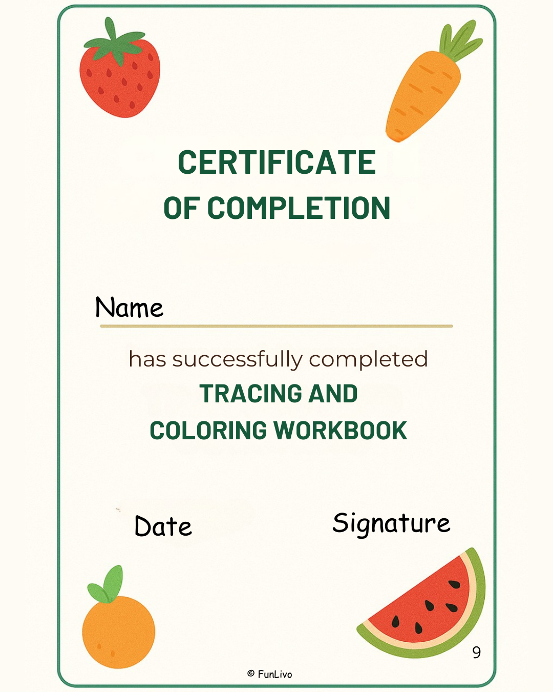 These fruits and vegetables tracing worksheets include bold outlines for beginners, child-friendly illustrations, and plenty of space for coloring. The mix of tracing + coloring makes learning more enjoyable and improves focus, creativity, and pre-writing skills.