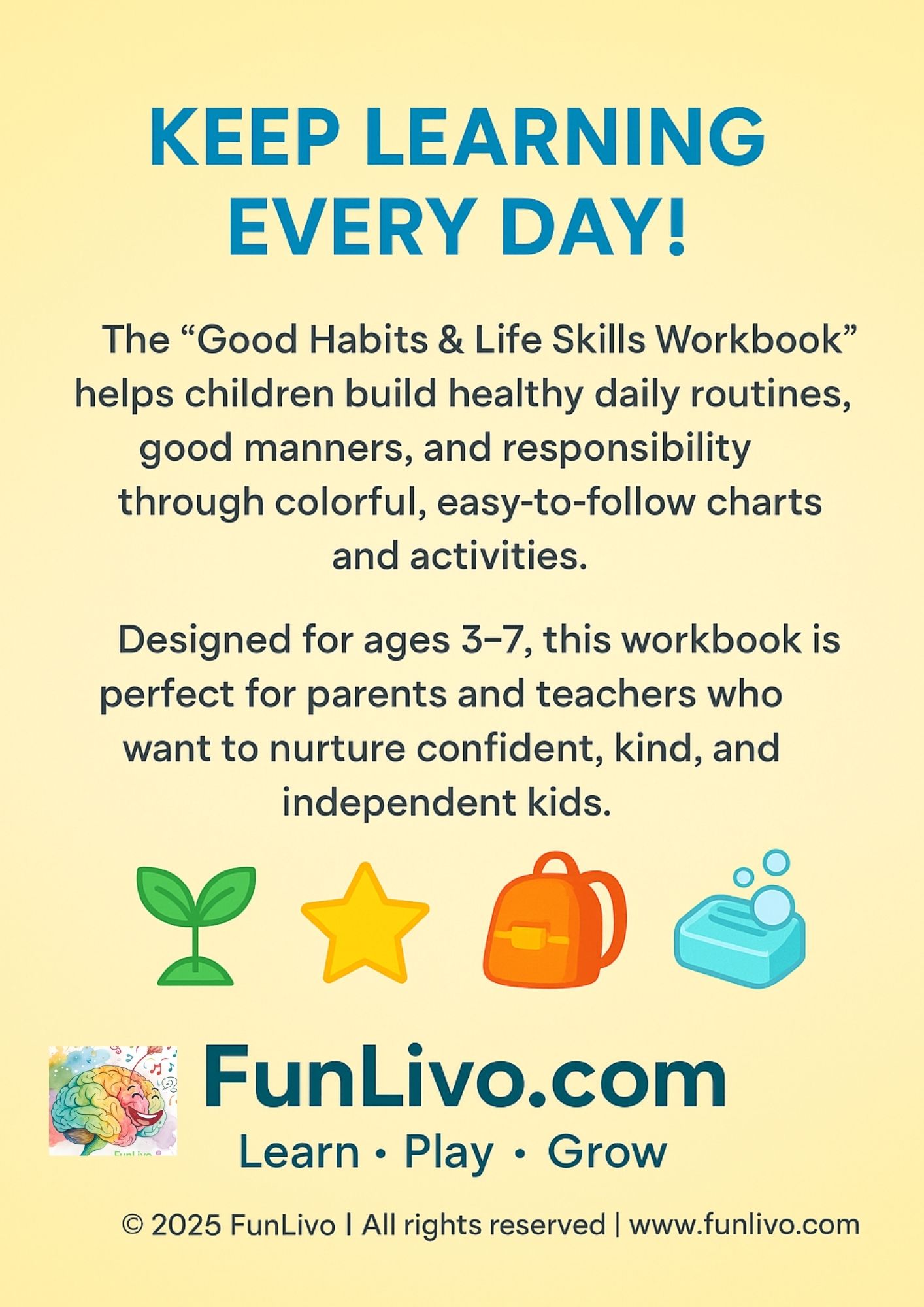 This workbook covers daily routine, hygiene, manners, responsibility, and reward tracking — the foundation for every confident and kind child.