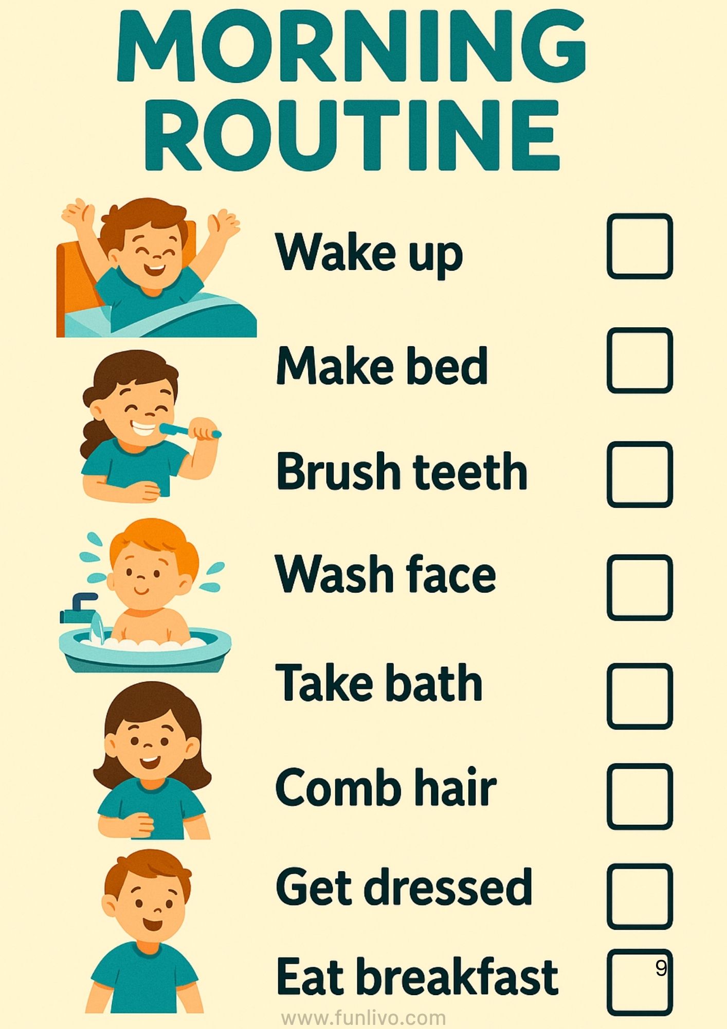 🧩 Daily Routine Charts: Morning, Evening, and School Day checklists.