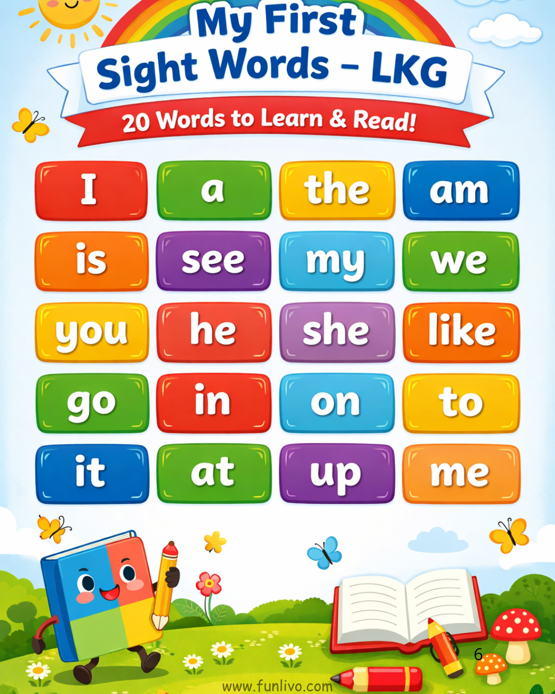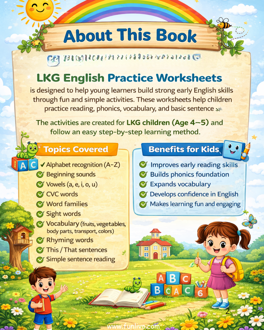 LKG English Practice Worksheets | Preschool Phonics & Sight Words Workbook | Alphabet Tracing, CVC Words, Reading Activities | Ages 4–5 Printable PDF