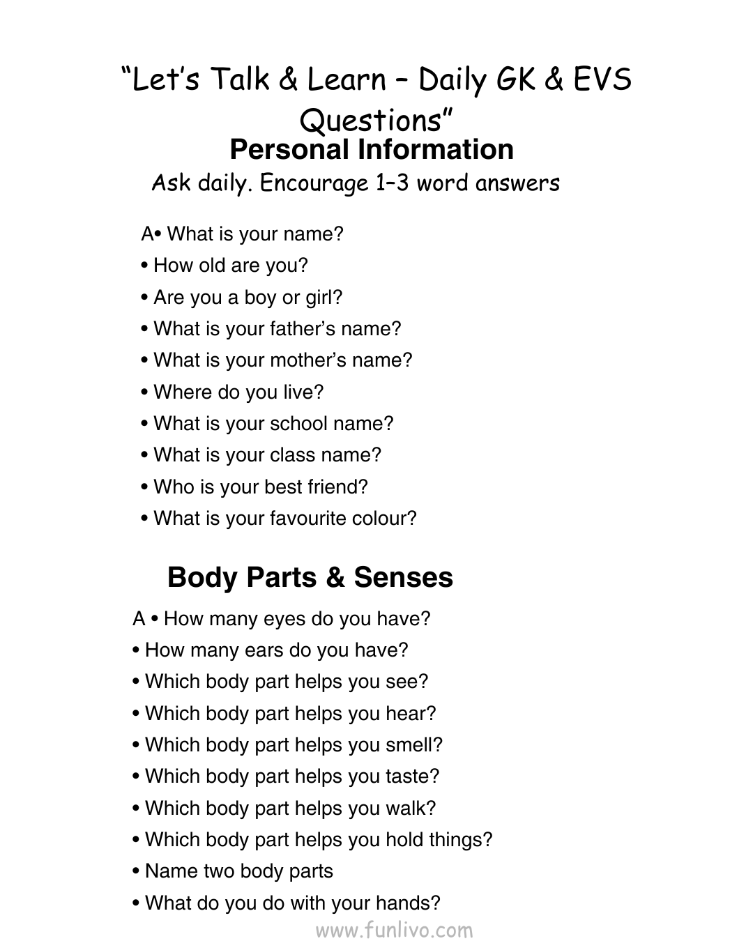 • Body Parts and Sense Organs