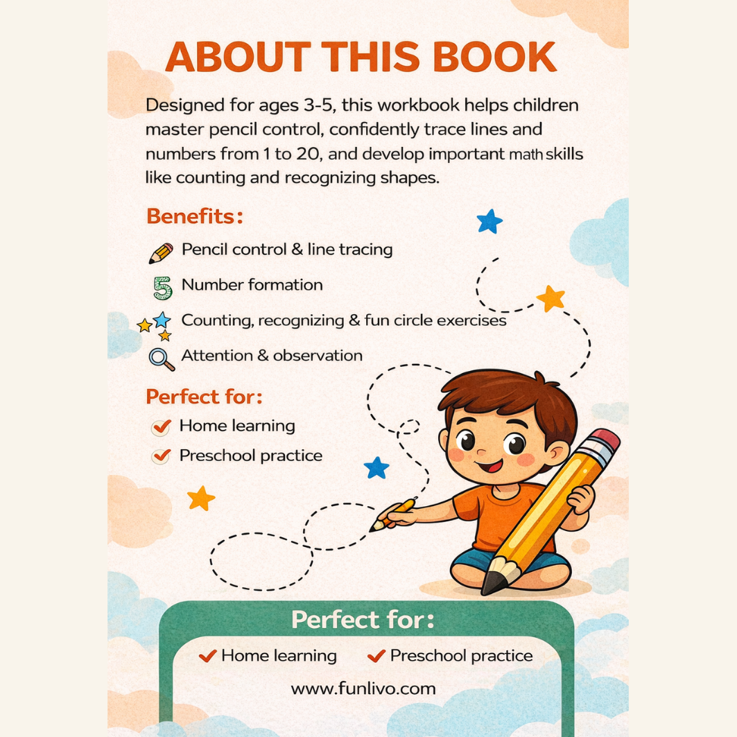 This number tracing workbook for preschoolers is designed to help children ages 3–5 build strong early math and writing skills. It includes engaging activities for tracing numbers 1–20, line tracing, shape tracing, and fun count-and-circle exercises that support preschool learning.