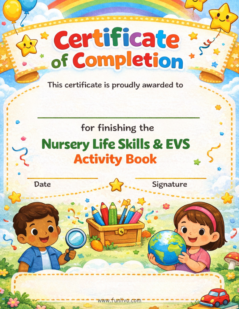 The Nursery EVS activity book is designed for children aged 3–5 years to build early awareness about themselves and the world around them through fun and simple learning activities.