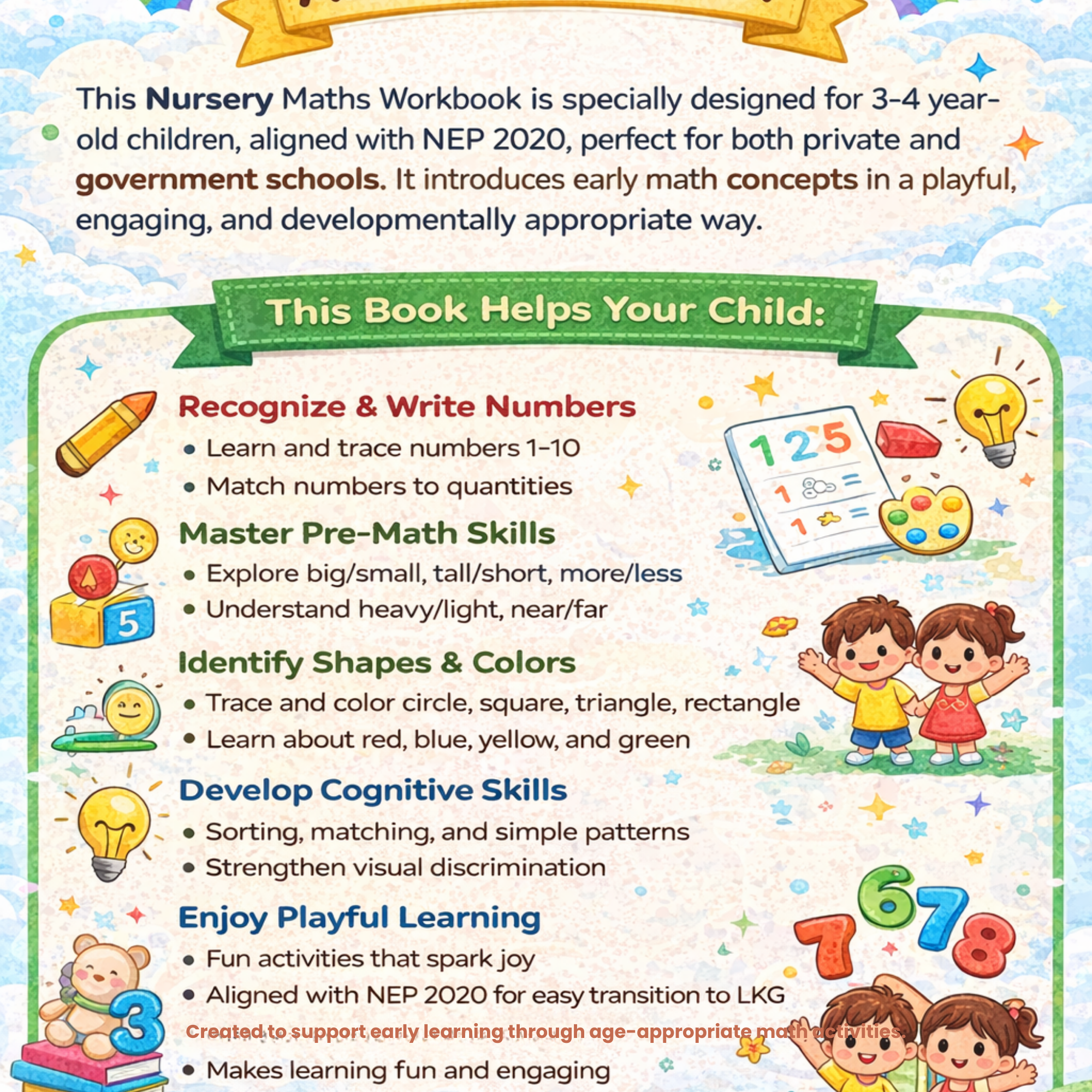 This nursery maths workbook is created to support early math learning through simple, playful, and age-appropriate practice activities.