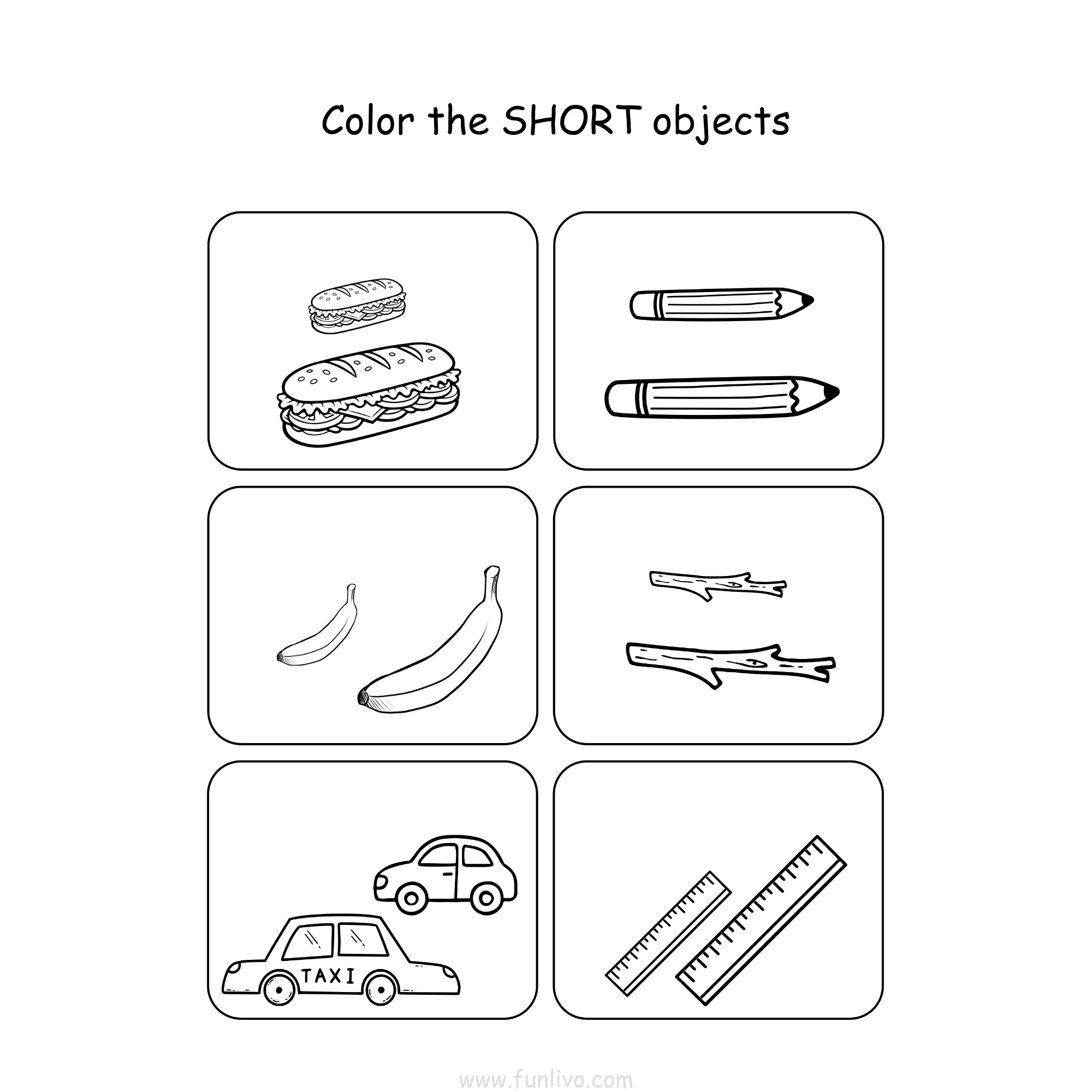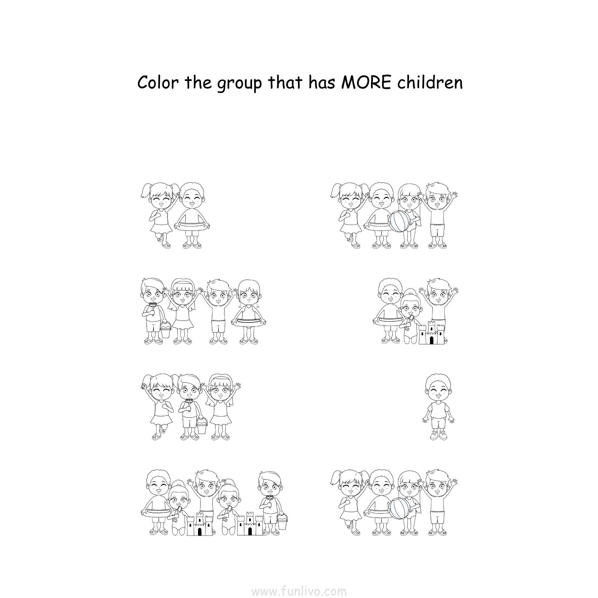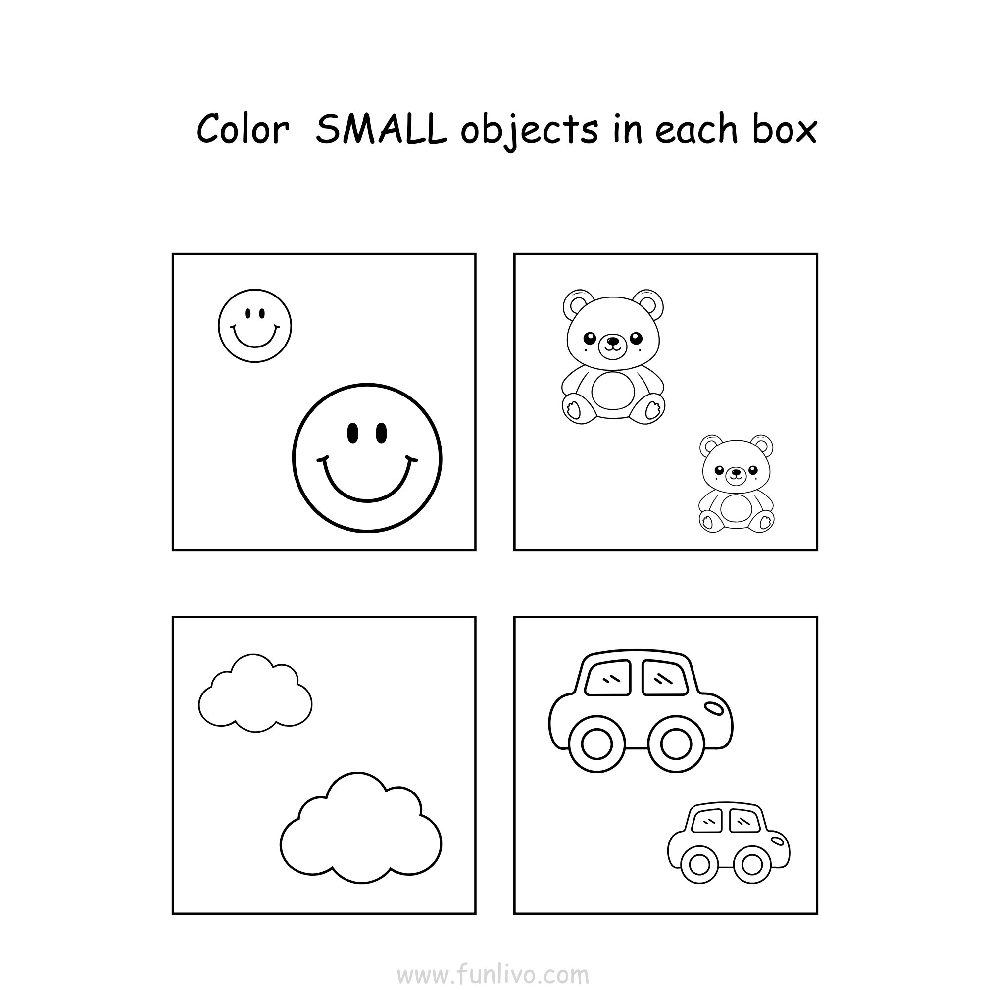 - Pre-math concepts such as big/small, tall/short, more/less, heavy/light, near/far