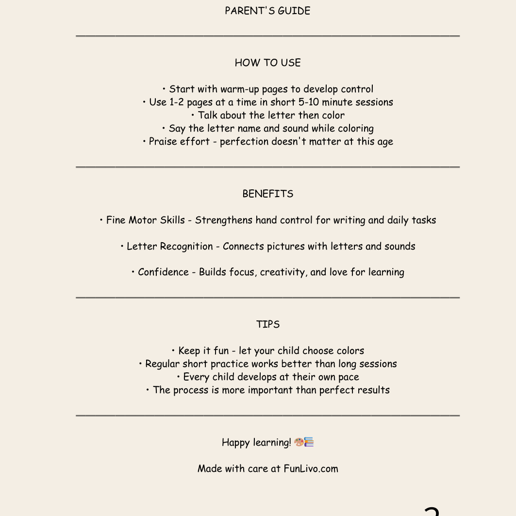 Introduce your toddler to the alphabet with this uppercase letter coloring workbook designed specially for ages 2–4. This printable activity book helps little learners build early writing confidence through simple tracing lines and big, bold letters to color.
