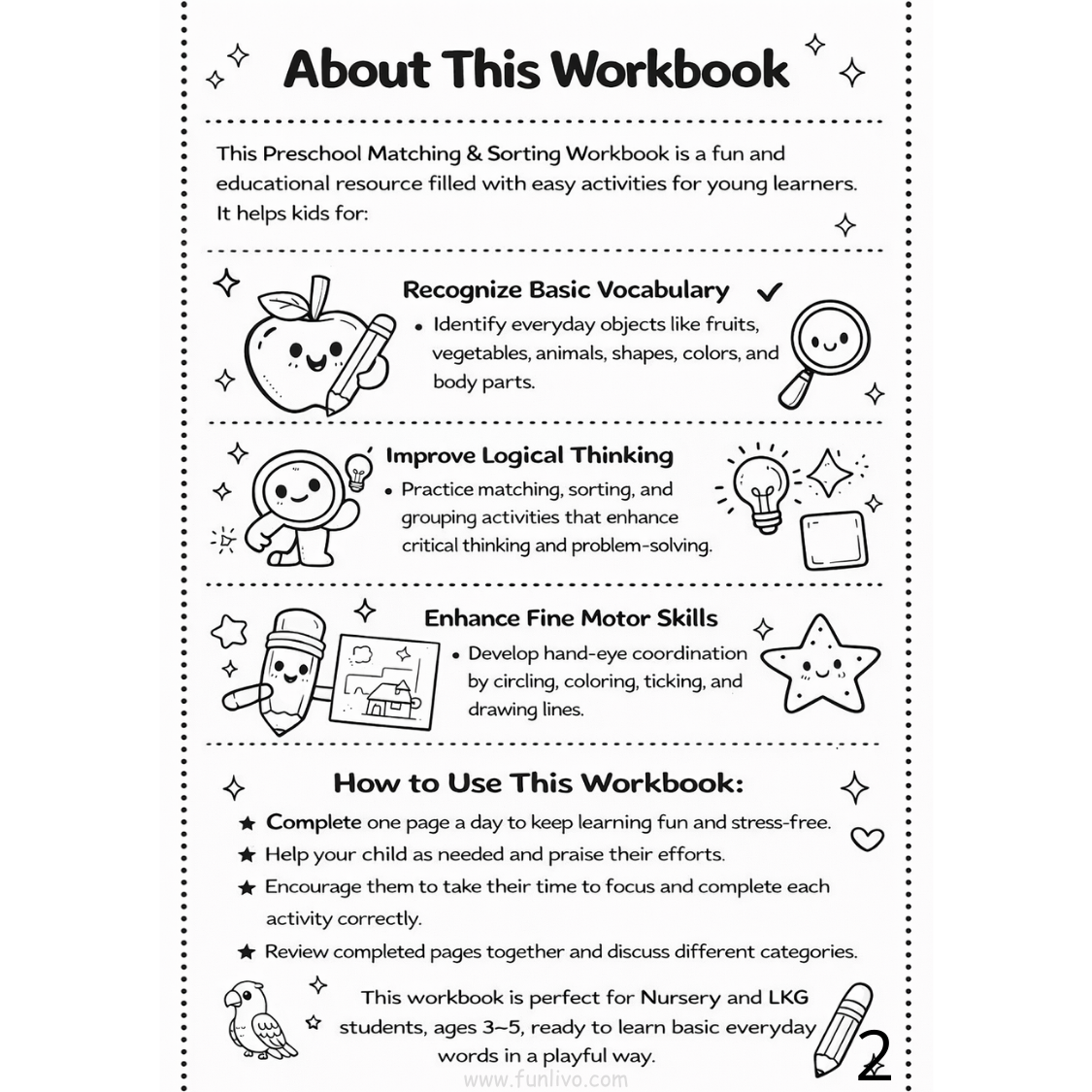 This Preschool Matching and Sorting Workbook is designed for children ages 3–5 (Nursery & LKG) to build early thinking, vocabulary, and logical reasoning skills through fun and simple learning activities.