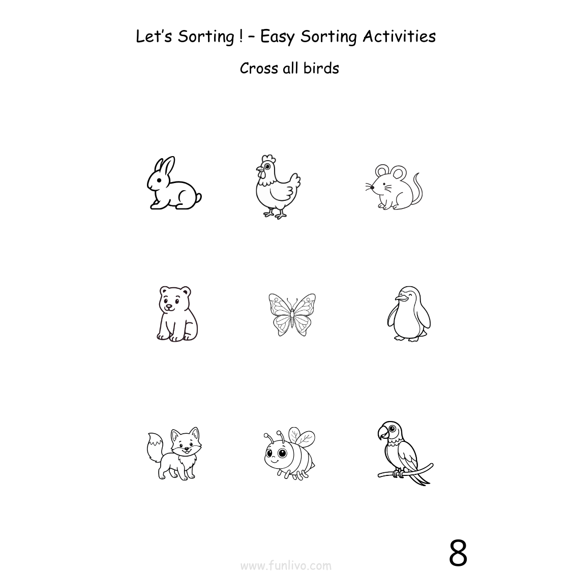 - Sorting activities (circle, tick, cross, and color correct objects)