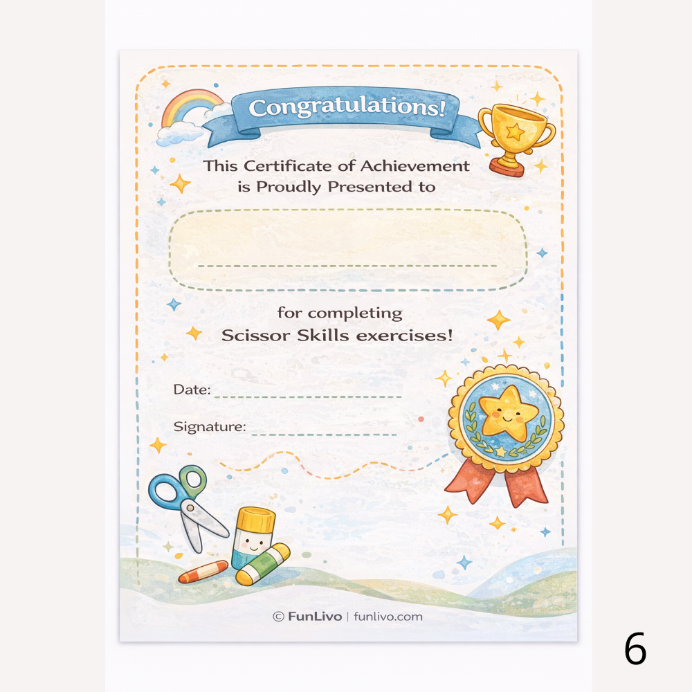 This scissor skills for toddlers workbook includes multiple pages covering cutting lines, shapes, safety rules, progress tracking, and a certificate.
