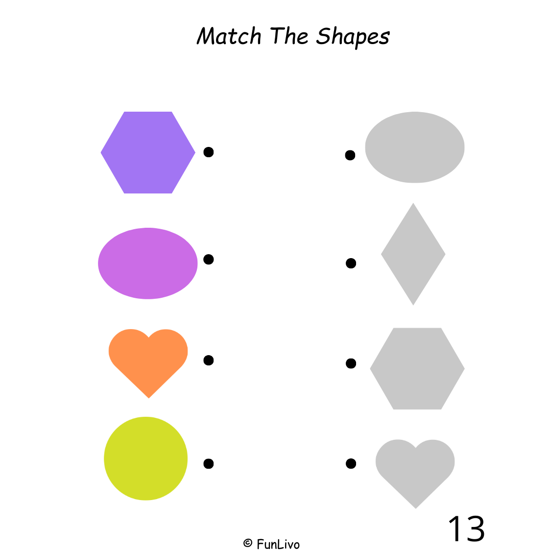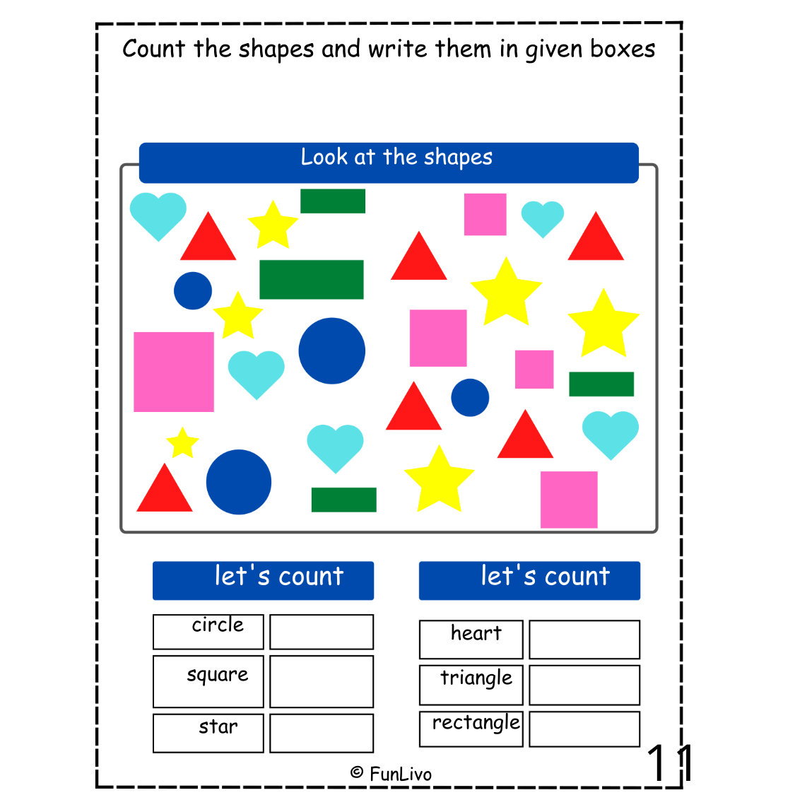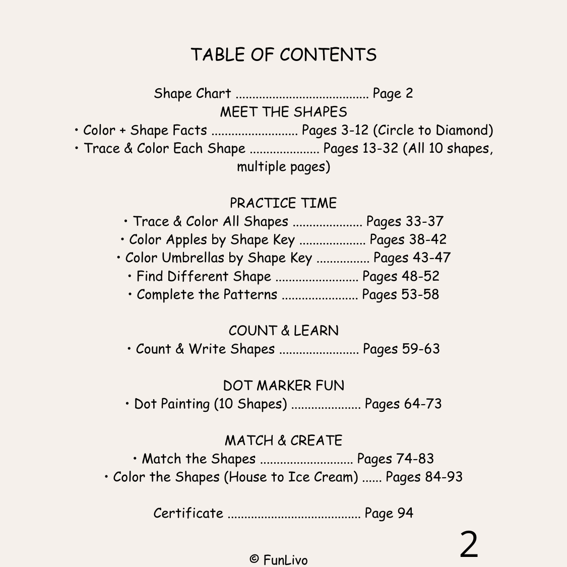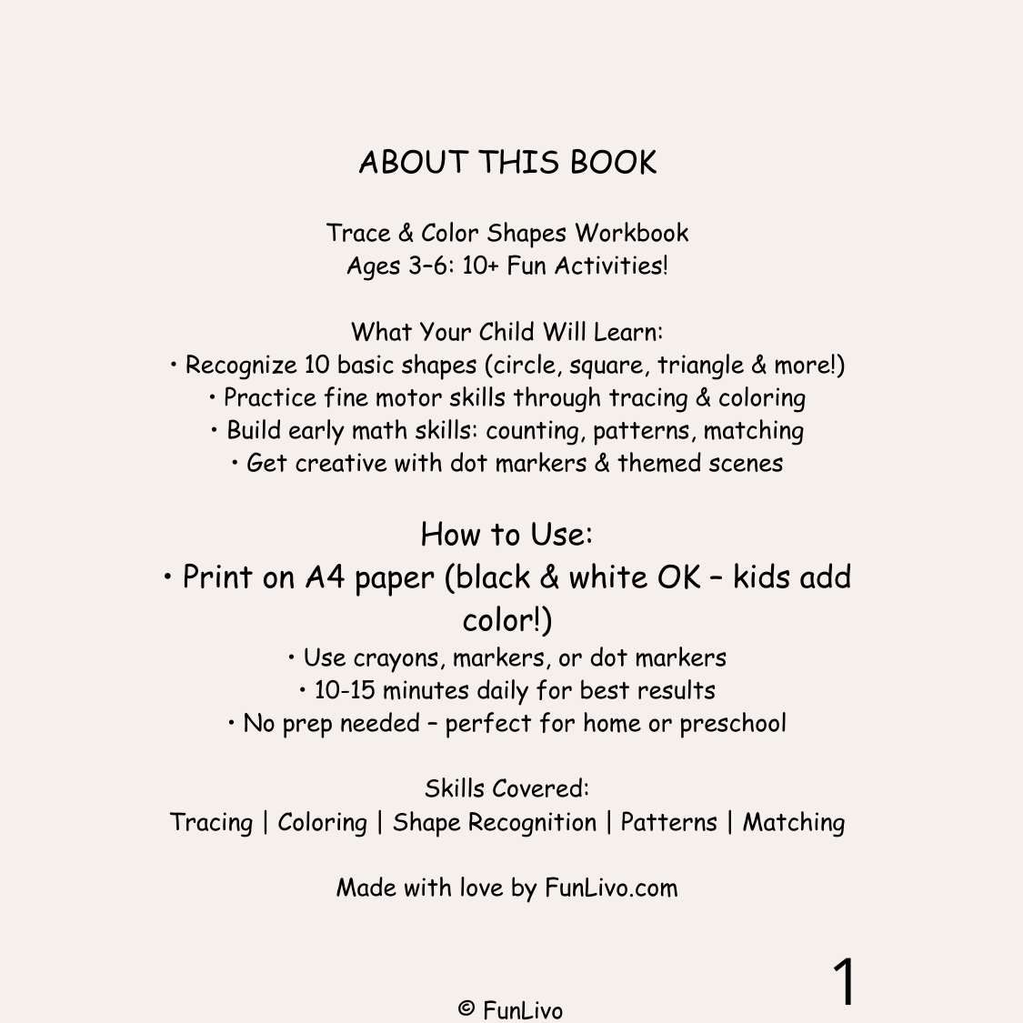 Your child will explore 10 basic shapes — circle, square, rectangle, triangle, star, oval, heart, pentagon, hexagon, and diamond. Each shape includes multiple activities such as trace & color, picture tracing, shape objects (house, robot, fish, rocket, and more), patterns, counting shapes, and dot marker fun. Playful cartoon characters keep kids excited and motivated on every page.