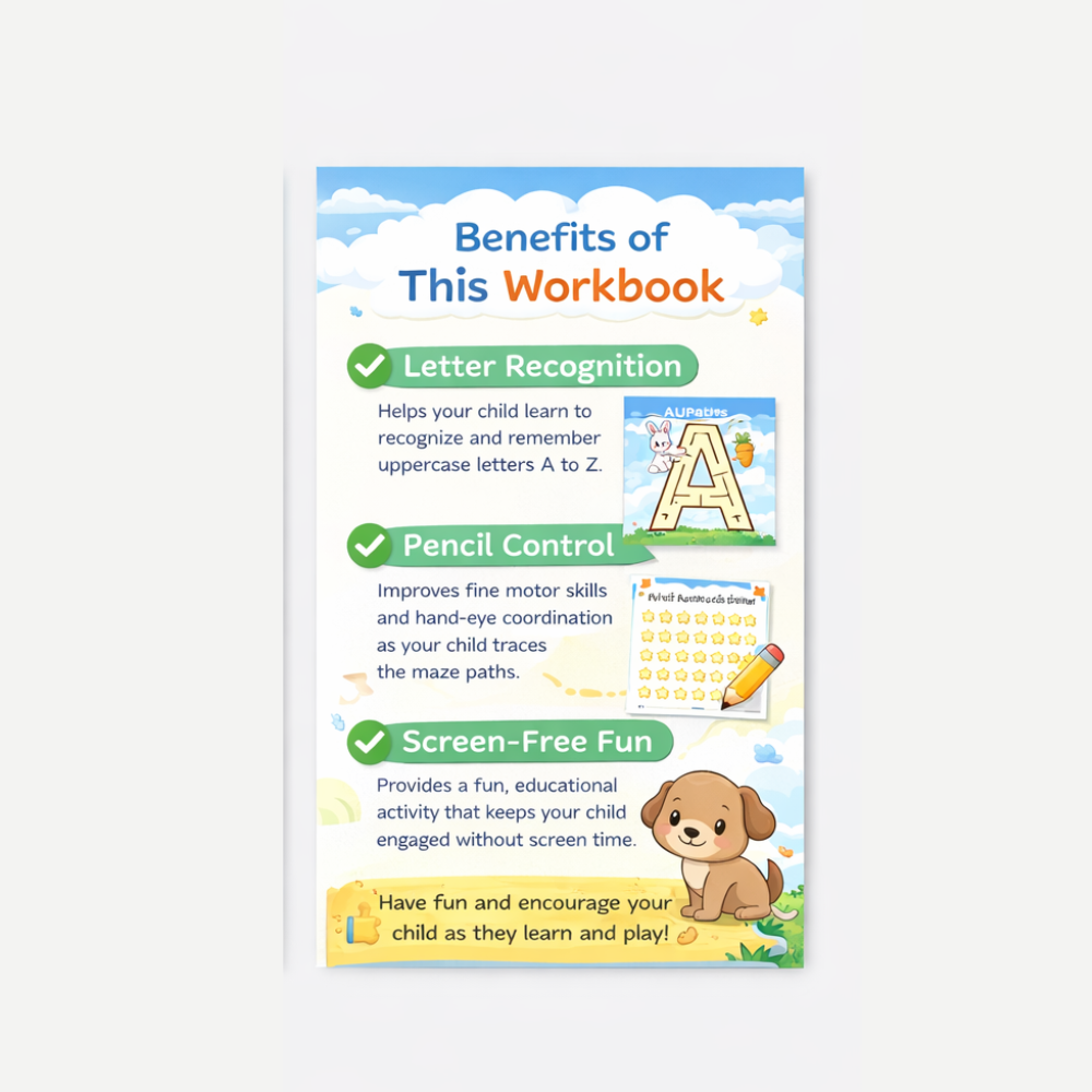 The Uppercase Alphabet Maze Workbook is a fun, screen-free learning resource designed to help preschool children aged 3–4 years recognize capital letters while building early pencil control. Instead of traditional tracing sheets, this workbook uses engaging letter-shaped mazes that turn alphabet practice into a playful challenge.